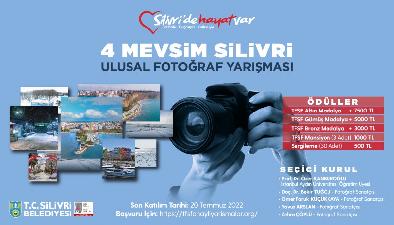 Silivri Belediyesi tarafından bu yıl 3'üncüsü gerçekleştirilecek olan fotoğraf yarışması ulusal düzeye taşındı. İlçenin tanıtımına yönelik ‘Silivri'de Hayat Var' temasıyla Silivri sınırları içindeki doğal güzellikler, kültürel değerler, tarihi mekânlar, şehir dokusu, tarım alanları gibi unsurların 4 mevsim haliyle, fotoğraf sanatçıları tarafından kadraja alınacağı ve Silivri için görsel bir arşiv oluşturmak, geleceğe miras bırakmak amacıyla Türkiye Fotoğraf Sanatı Federasyonu (TFSF) işbirliği ile gerçekleştirilen “4 Mevsim Silivri Ulusal Fotoğraf Yarışması” 9 Kasım 2021 itibarıyla başladı. Seçici kurulunda; İstanbul Aydın Üniversitesi Öğretim Üyesi Prof. Özer Kanburoğlu, Fotoğraf Sanatçısı Doç. Dr. Bekir Tuğcu, Fotoğraf Sanatçısı Ömer Faruk Küçükkaya, Fotoğraf Sanatçısı Yavuz Arslan ve Fotoğraf Sanatçısı Zehra Çöplü gibi usta isimlerin yer aldığı yarışmaya son katılım tarihi 20 Temmuz 2022 olarak belirlendi.