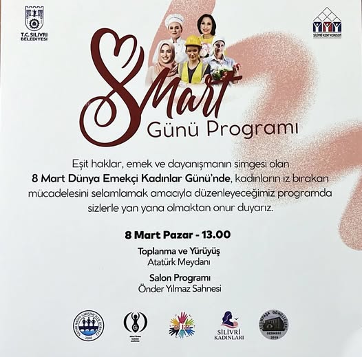 Silivri Kent Konseyi'nin çağrısıyla, kadın kuruluşlarının katılımı ve Silivri Belediyesi'nin destekleriyle 8 Mart Dünya Emekçi Kadınlar Günü kapsamında yürüyüş ve salon programı düzenlenecek.