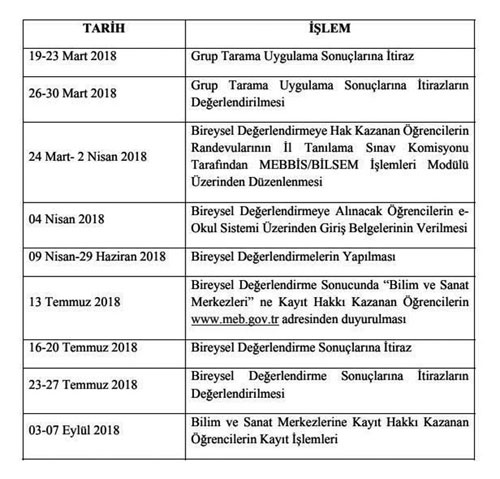 Milli Eğitim Bakanlığı Özel Eğitim ve Rehberlik Hizmetleri Genel Müdürlüğü, 2017-2018 Bilim ve Sanat Merkezleri Öğrenci Tanılama Kılavuzu kapsamında gerçekleştirilen bireysel değerlendirme sonuçlarının 13 Temmuz 2018 tarihinde açıklanacağını duyurdu. Güncellenen takvime göre kayıt hakkı kazanan öğrenciler www.meb.gov.tr adresinden 13 Temmuz 2018 tarihinde duyurulacak. Bireysel Değerlendirme Sonuçlarına itiraz 16-20 Temmuz 2018 tarihleri arasında gerçekleştirilecek. İtirazlar, 23-27 Temmuz 2018 tarihleri arasında değerlendirilecek. Bilim ve Sanat Merkezlerine Kayıt Hakkı Kazanan öğrencilerin kayıt işlemleri ise 03-07 Eylül 2018 tarihleri arasında gerçekleştirilecek.