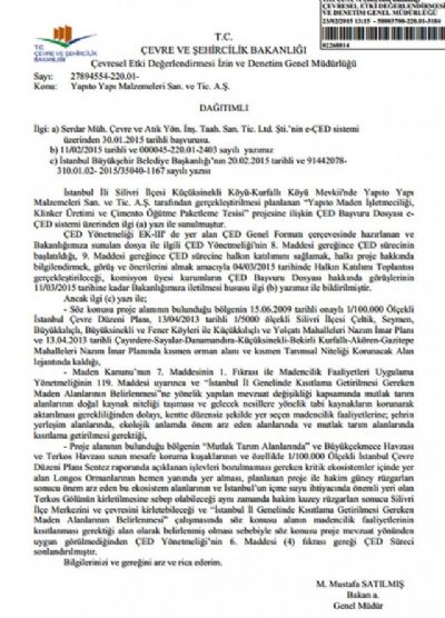 SÖZ KONUSU PROJE MEVZUAT YÖNÜNDEN UYGUN GÖRÜLMEDİĞİNDEN ÇED YÖNETMELİĞİ’NİN 6. MADDESİ (4) FIKRASI GEREĞİ ÇED SÜRECİ SONLANDIRILMIŞTIR.”