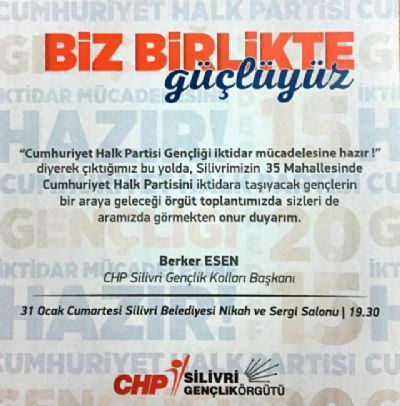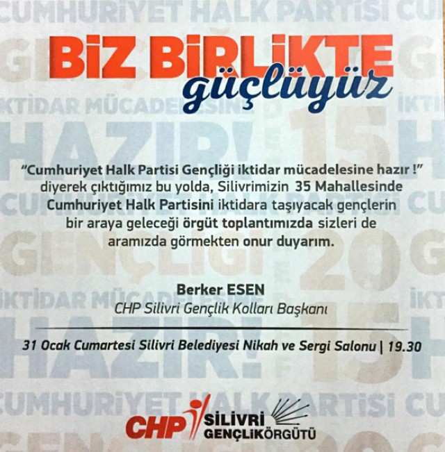 Tüm bu duygu ve düşüncelerle Silivri’de yaşayan CHP’ye gönül vermiş veya sempati duyan genç arkadaşlarımı 31 Ocak Cumartesi saat 19:30’da Silivri Belediyesi Nikah ve Sergi Salonu’nda gerçekleştireceğimiz örgüt toplantımıza davet ediyorum.”