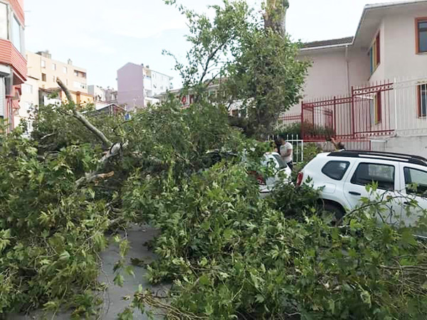 Önceki gün Silivri'de yaşanan şiddetli fırtınada, ilçemizin birçok bölgesinde ağaçlar zarar görürken, Fatih Mahallesi Turgut Reis İlkokulu yanındaki çınar ağacı da orta yerinden kırılarak yola düştü.