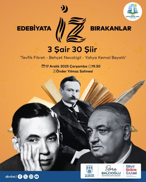 Silivri Kültür Edebiyat Sanat Topluluğu tarafından gerçekleştirilecek olan özel şiir gecesinde, Türk edebiyatının üç önemli ismi Tevfik Fikret, Behçet Necatigil ve Yahya Kemal Beyatlı anılacak. “Edebiyata İz Bırakanlar – 3 Şair 30 Şiir” başlığıyla düzenlenen etkinlikte, usta şairlerin edebiyatımıza damga vuran dizeleri sahnede hayat bulacak.