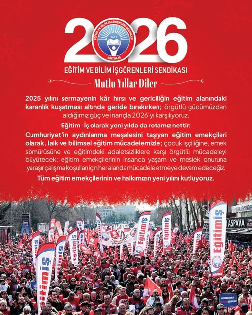 Eğitim-İş açıklamasında,“Mücadele dolu bir yılı geride bırakırken, yeni yıla örgütümüzden aldığımız güç ve dayanışma ile giriyoruz. 2026'da da Cumhuriyetten, emekten, laik ve bilimsel eğitim hakkından yana kararlılıkla mücadele etmeye devam edeceğiz” ifadelerine yer verildi.