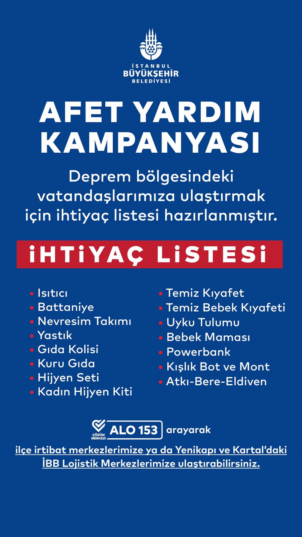 Bağış yapmak isteyen İstanbullular ALO 153 Çözüm Merkezi numarası üzerinden ‘Deprem Hattı'na bağlanarak ihtiyaç listelerine ulaşabilirler. İstanbullular, yardım malzemelerini Yenikapı Avrasya Gösteri Merkezi ile Kartal Lojistik Merkezi'ne bırakabilirler. Yardım kampanyası kapsamında ikinci ürünler kabul edilmeyecek, sadece kullanılmamış ürünler değerlendirilecek.