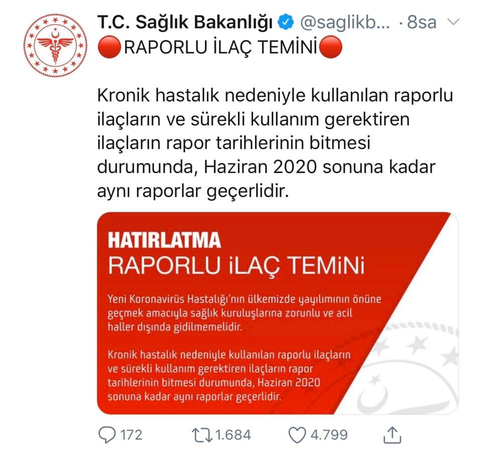 Kronik hastalık nedeniyle kullanılan raporlu ilaçların ve sürekli kullanım gerektiren ilaçların rapor tarihlerinin bitmesi durumunda, Haziran 2020 sonuna kadar aynı raporların geçerli olacağı duyuruldu.