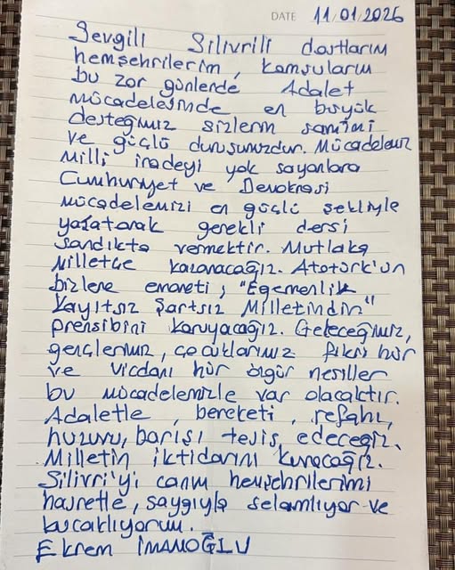 Ekrem İmamoğlu, 11 Ocak 2026 tarihli el yazısıyla kaleme aldığı mesajında Silivrililere şu sözlerle seslendi:“Bu zor günlerde adalet mücadelesinde en büyük desteğimiz sizlerin samimi ve güçlü duruşudur. Mücadelemiz, milli iradeyi yok sayanlara, Cumhuriyet'e ve demokrasiye karşı olanlara karşıdır. Mücadelemizi en güçlü şekilde yaşatarak gerekli dersi sandıkta vereceğiz. Mutlaka birlikte kazanacağız.”