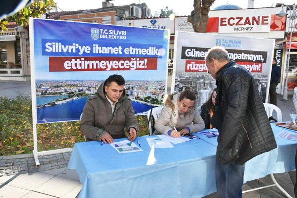 “Silivri'ye ihanet etmedik, etmeyeceğiz”, “Güneşimizi kapatmayın, rüzgarımızı kesmeyin!” dövizlerinin yazılı olduğu imza kürsüsünde belediye yetkilileri ile Çevre Derneği Başkanı Ali Korsan, vatandaşlardan KİPTAŞ 3'ün kat yüksekliğinin düşürülmesi ve daha uygun bir yere taşınması için imza topluyor.
