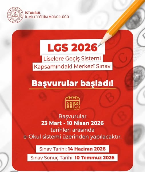 İstanbul İl Millî Eğitim Müdürlüğü tarafından yapılan duyuruya göre LGS 2026 kapsamındaki Merkezi Sınav başvuruları 23 Mart–10 Nisan 2026 tarihleri arasında e-Okul sistemi üzerinden gerçekleştirilecek.