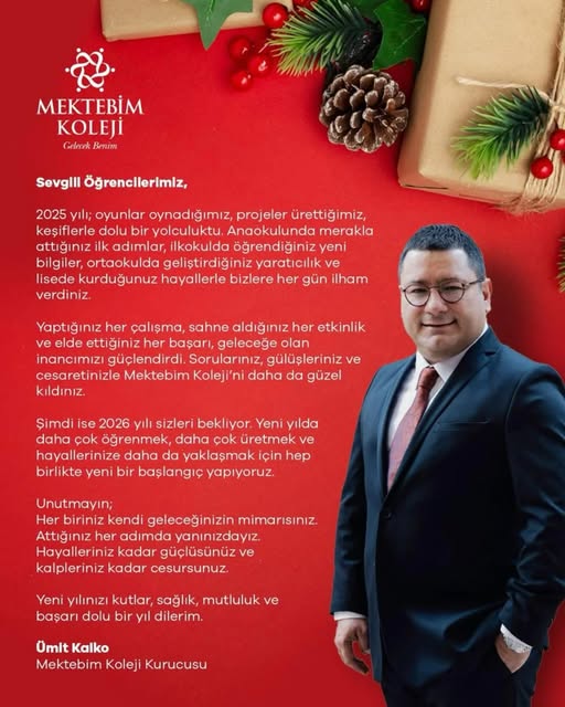Mektebim Koleji Kurucusu Ümit Kalko, 2025 yılının öğrenme, üretme ve hayallerle dolu bir yolculuk olduğunu vurgulayarak, öğrencilerin her kademede gösterdiği gelişimin kendilerine ilham verdiğini ifade etti.