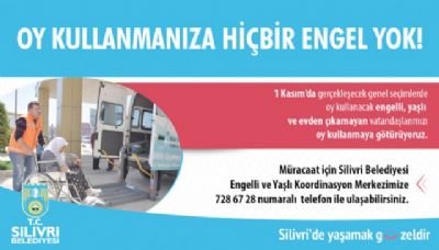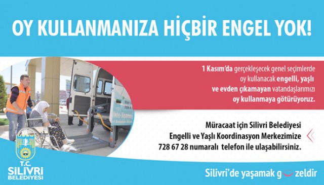 Konu ile ilgili bilgi veren Silivri Belediyesi Sosyal Yardım İşleri Müdürü Meral Demir Kutlu, "1 Kasım Pazar Günü gerçekleşecek olan seçimlerde oy kullanmak isteyen engelli, hasta ve evden çıkamayan vatandaşlarımızı gün boyunca özel nakil aracımızla evlerinden alarak oy kullanacakları okula götürüp, refakat hizmeti vereceğiz. Müracaat için Engelli ve Yaşlı Koordinasyon Merkezimize 728 67 28 numaralı telefon ile ulaşabilirsiniz” dedi.