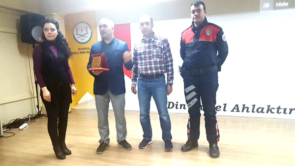 Okul Müdürü Abdurrahman Öztürkoğlu, değerli vaktini ayırarak davetlerine icabet eden, öğrencileri bilgilendiren Çocuk Polisi Komiser Murat Güner'e plaket sunarak teşekkür etti.