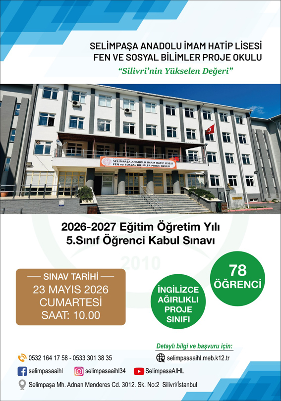 Selimpaşa Anadolu İmam Hatip Lisesi Fen ve Sosyal Bilimler Proje Okulu, 2026–2027 eğitim-öğretim yılı kapsamında 5. sınıf öğrenci kabul sınavı düzenleyeceğini duyurdu. İngilizce ağırlıklı proje sınıfına öğrenci alımı için yapılacak sınav, 23 Mayıs 2026 Cumartesi günü saat 10.00'da gerçekleştirilecek.