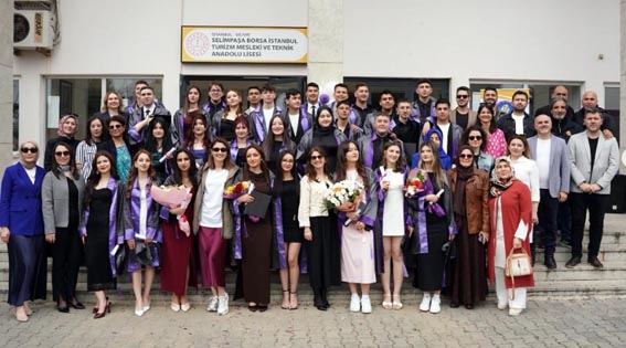 Selimpaşa Borsa İstanbul Turizm Mesleki ve Teknik Anadolu Lisesi'nde 2025–2026 eğitim öğretim yılı mezuniyet töreni, öğrenciler, öğretmenler ve protokol üyelerinin katılımıyla coşku ve gurur içinde gerçekleştirildi.