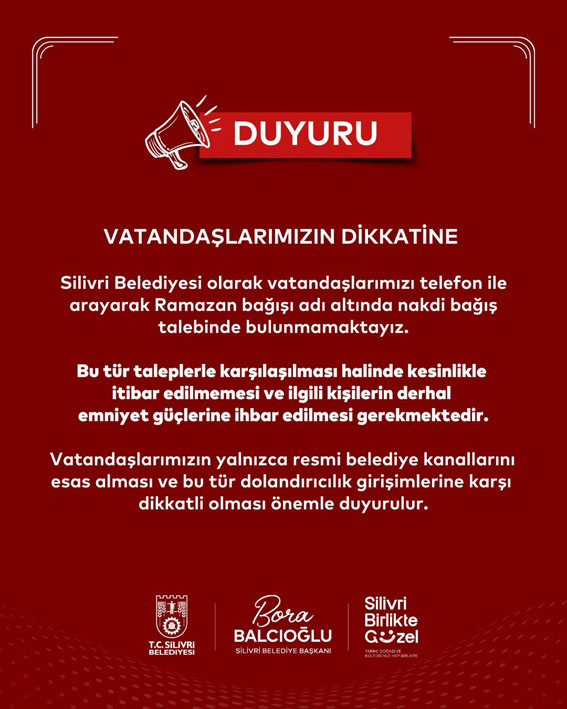 Telefonla “Ramazan bağışı” adı altında para talep eden kişilere itibar edilmemesi gerektiğini belirten Silivri Belediyesi, vatandaşların yalnızca resmi kanalları dikkate almasını ve dolandırıcılık girişimlerini emniyete bildirmesini istedi.