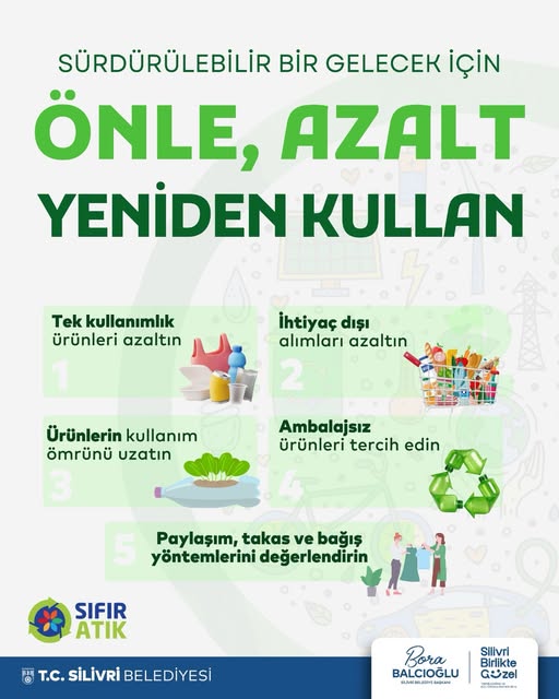 Silivri Belediyesi, Sıfır Atık anlayışı doğrultusunda sürdürülebilir bir gelecek için vatandaşlara günlük yaşamda uygulanabilecek çevre dostu alışkanlıklar konusunda çağrıda bulundu.