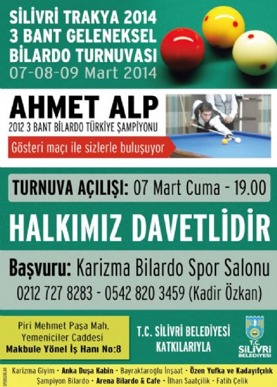 Piri Mehmet Paşa Mahallesi Yemeniciler Sokak Makbule Yönel İş Hanı’nda bulunan Karizma Bilardo Spor Salonu’nda yapılacak olan Trakya 3 Bant Turnuvasının açılışını ise 2012 Türkiye 3 Bant Şampiyonu Ahmet Alp’in yapacağı gösteri maçı ile başlayacak. Akif Çetin’in sahibi olduğu salon olan Karizma’da gerçekleştirilecek olan turnuvaya Silivri Belediyesi de sponsor oldu. 3 gün sürecek olan ve oldukça çekişmeli maçlara sahne olacak turnuvayı takip etmek isteyenler Karizma’daki yerlerini şimdiden ayırttı.