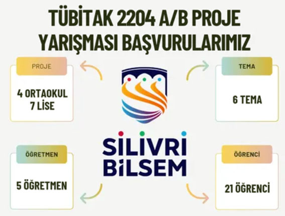 Silivri Bilim ve Sanat Merkezi (BİLSEM), bilimsel düşünceyi merkeze alan çalışmalarıyla TÜBİTAK 2204-A Lise Öğrencileri Araştırma Projeleri Yarışması ve TÜBİTAK 2204-B Ortaokul Öğrencileri Araştırma Projeleri Yarışması'na toplam 11 projeyle başvuru gerçekleştirdi.