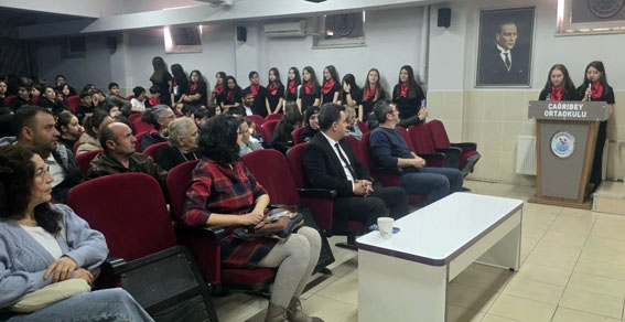 Çağrıbey Ortaokulu'nda 18 Mart Şehitleri Anma Günü ve Çanakkale Zaferi'nin 111. yıl dönümü dolayısıyla düzenlenen programda öğrencilerin hazırladığı şiirler, oratoryo, zeybek gösterisi ve türküler duygu dolu anlar yaşattı.