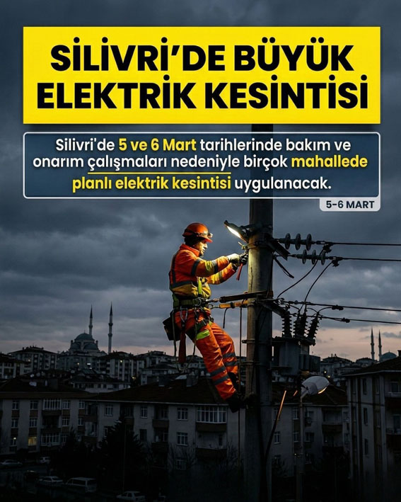 Silivri'de 5 ve 6 Mart 2026 tarihlerinde bakım, onarım ve yatırım çalışmaları nedeniyle bazı mahallelerde planlı elektrik kesintisi uygulanacak.