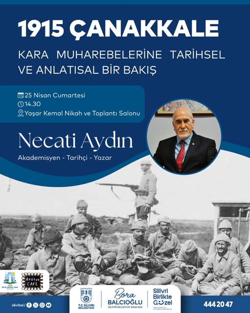 Silivri Kültür Edebiyat Sanat Topluluğu ve Atölye Cafe iş birliğiyle düzenlenecek “1915 Çanakkale Kara Muharebelerine Tarihsel ve Anlatısal Bir Bakış” seminerinde tarihçi Necati Aydın Silivrililerle buluşacak; programda Silivrili şehitlerin isimleri okunacak, temsili canlandırma yapılacak ve şehitler hayrına lokma dağıtılacak.