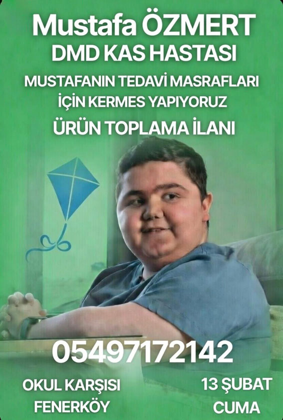 Duchenne Musküler Distrofi (DMD) hastası Mustafa Özmert'in tedavi masraflarına destek olmak amacıyla kermes düzenleniyor ve bağış kampanyası yürütülüyor. Aile ve gönüllüler, hem ürün bağışı hem de maddi destekle Mustafa'nın tedavisine ulaşabilmesi için dayanışma çağrısı yaptı.