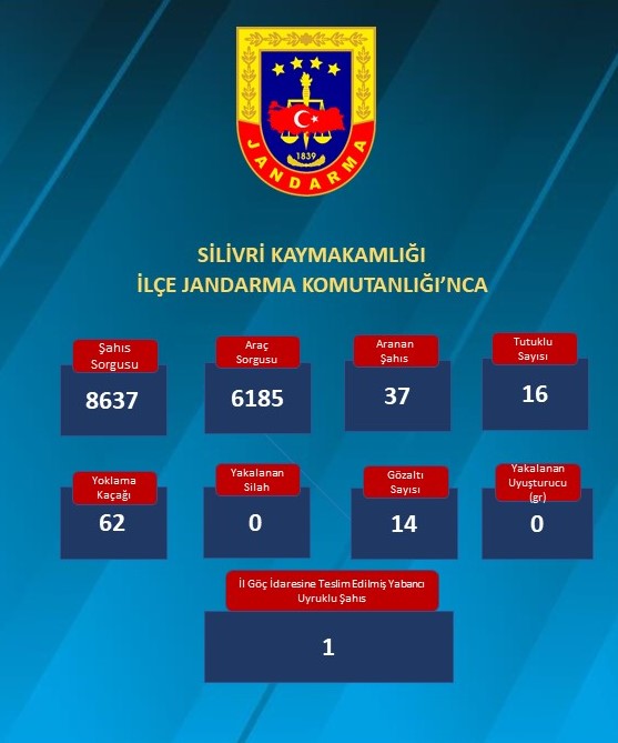 İlçe Jandarma Komutanlığı ekiplerince gerçekleştirilen uygulamalarda 8 bin 637 şahıs sorgulandı, 6 bin 185 araç kontrol edildi. Denetimlerde 37 aranan şahıs tespit edilirken, bunlardan 16'sı tutuklandı. Ayrıca 14 kişi gözaltına alındı. Yapılan kontrollerde 62 yoklama kaçağı hakkında işlem uygulanırken, 1 yabancı uyruklu şahıs da İl Göç İdaresi'ne teslim edildi.