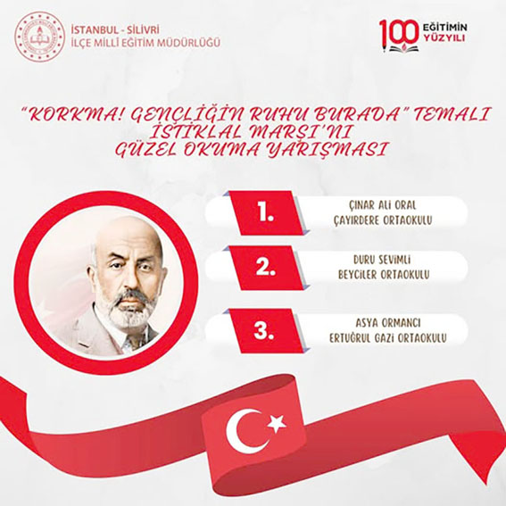 Silivri İlçe Milli Eğitim Müdürlüğü koordinesinde, “Korkma! Gençliğin Ruhu Burada” temasıyla düzenlenen İstiklal Marşı'nı Güzel Okuma Yarışması İlçe Finali başarıyla tamamlandı.