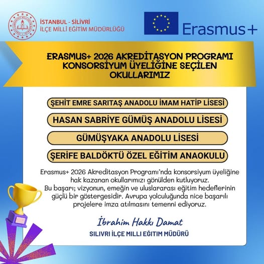 Silivri İlçe Milli Eğitim Müdürlüğü, Erasmus+ 2026 Akreditasyon Programı kapsamında konsorsiyum üyeliğine seçilen okulları açıkladı. İlçeden dört okul uluslararası eğitim yolculuğuna katılma hakkı kazandı.