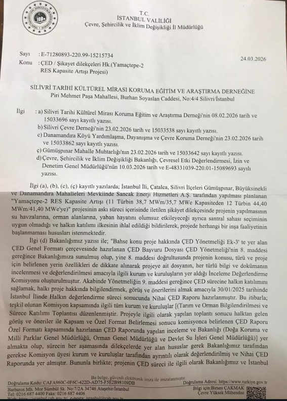 Açıklamada, İstanbul İl Çevre, Şehircilik ve İklim Değişikliği Müdürlüğü tarafından verilen cevabi yazıda ise halkın katılımı toplantısının yapıldığı ve halkın görüşleri doğrultusunda ÇED Nihai Raporu'nun hazırlandığının ifade edildiği hatırlatıldı.
