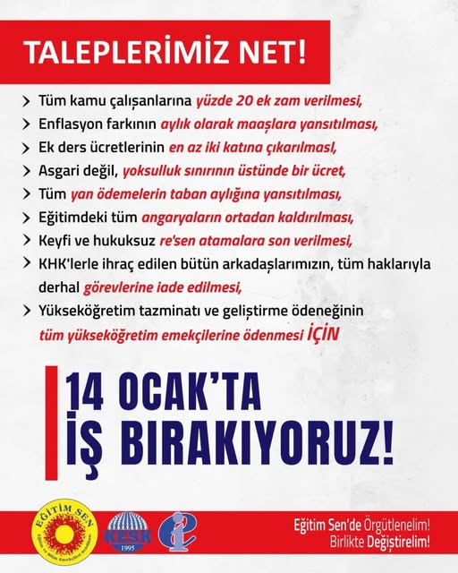 Caner Erdoğan, eğitim emekçilerinin ve tüm kamu çalışanlarının insanca yaşam koşulları ve adil ücret taleplerinin karşılanması için 14 Ocak'ta iş bırakacaklarını belirterek, tüm emekçileri bu haklı mücadeleye destek vermeye çağırdı.