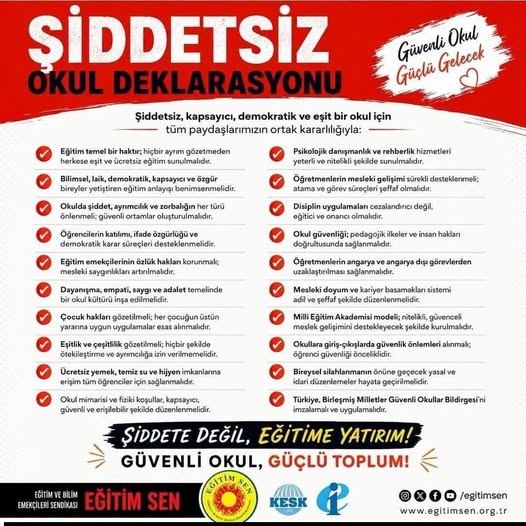 Eğitim-Sen Sendikası , “Güvenli okul, güvenli gelecek, güçlü toplum” vurgusuyla hazırladığı Şiddetsiz Okul Deklarasyonu kapsamında eğitim ortamlarında şiddetin önlenmesine yönelik önerilerini kamuoyuyla paylaştı.