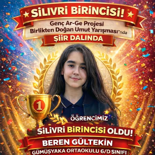 Genç Ar-Ge Projesi “Birlikten Doğan Umut” Yarışması kapsamında düzenlenen şiir dalında, Gümüşyaka Ortaokulu öğrencisi Beren Gültekin, Silivri ilçe birincisi olarak önemli bir başarıya imza attı.