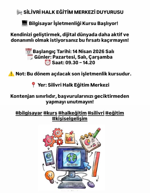 Silivri Halk Eğitim Merkezi tarafından açılacak Bilgisayar İşletmenliği Kursu için başvurular başladı. 14 Nisan 2026 Salı günü başlayacak kursun bu dönem açılacak son işletmenlik kursu olduğu bildirildi.