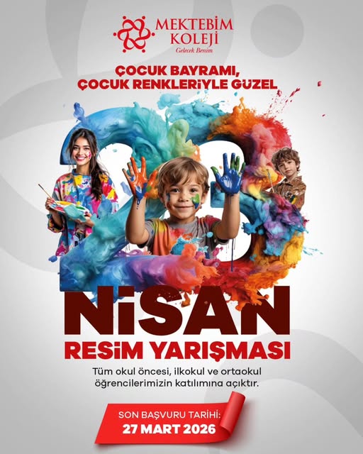 Mektebim Koleji, 23 Nisan Ulusal Egemenlik ve Çocuk Bayramı kapsamında okul öncesi, ilkokul ve ortaokul öğrencilerine yönelik “Nisan Resim Yarışması” düzenliyor. Son başvuru tarihi 27 Mart 2026.