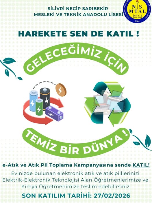 Necip Sarıbekir Mesleki ve Teknik Anadolu Lisesi, çevresel sürdürülebilirliğe katkı sağlamak amacıyla e-atık ve atık pil toplama kampanyası başlattı. “Çöpe Atma Artık” projesi kapsamında yürütülen çalışma ile elektronik atıkların geri dönüşüme kazandırılması ve çevre bilincinin artırılması hedefleniyor.