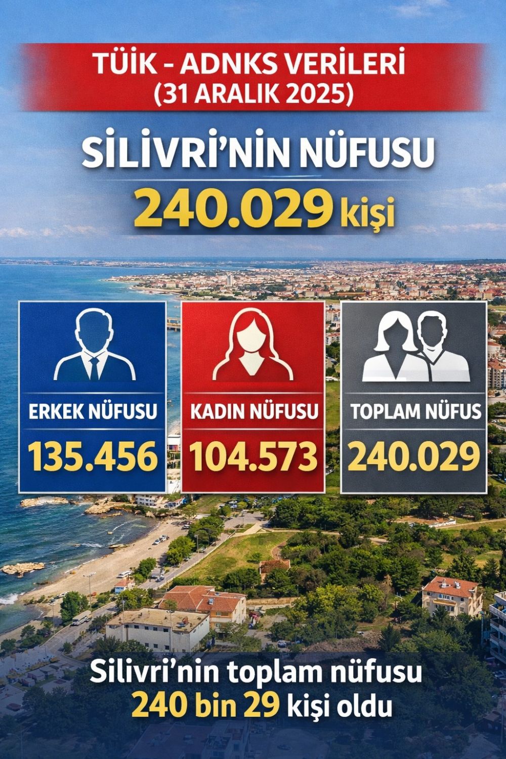 TÜİK tarafından açıklanan 31 Aralık 2025 tarihli verilere göre Silivri'de erkek nüfus 135 bin 456, kadın nüfus ise 104 bin 573 olarak kaydedildi. Bir önceki yılın verilerinde nüfus 232 bin 156 olarak açıklanmıştı. Böylece ilçede nüfus artış eğiliminin devam ettiği görüldü.
