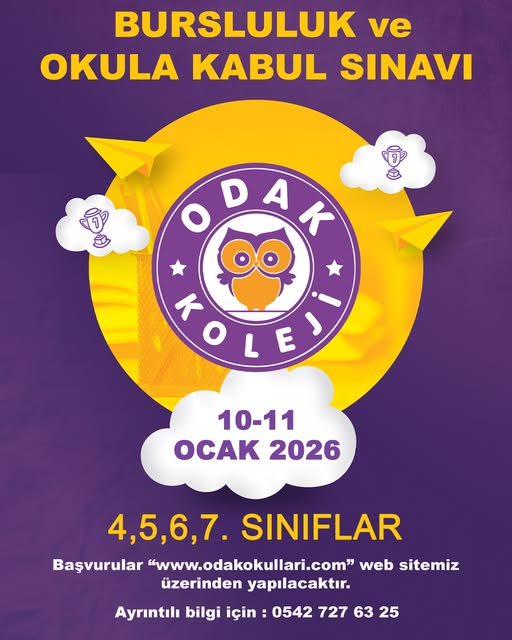 Odak Koleji tarafından düzenlenen Bursluluk ve Okula Kabul Sınavı için başvurular başladı. 4, 5, 6 ve 7. sınıf öğrencilerine yönelik olarak gerçekleştirilecek sınav, 10–11 Ocak 2026 tarihlerinde yapılacak.