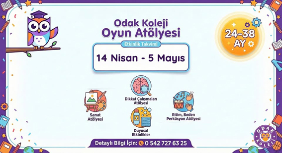Odak Koleji tarafından 24–38 ay arası çocuklara yönelik hazırlanan Oyun Atölyesi, 14 Nisan–5 Mayıs tarihleri arasında Salı günleri gerçekleştirilecek. Atölyede çocukların gelişimini destekleyen eğitici ve eğlenceli etkinlikler yer alacak.