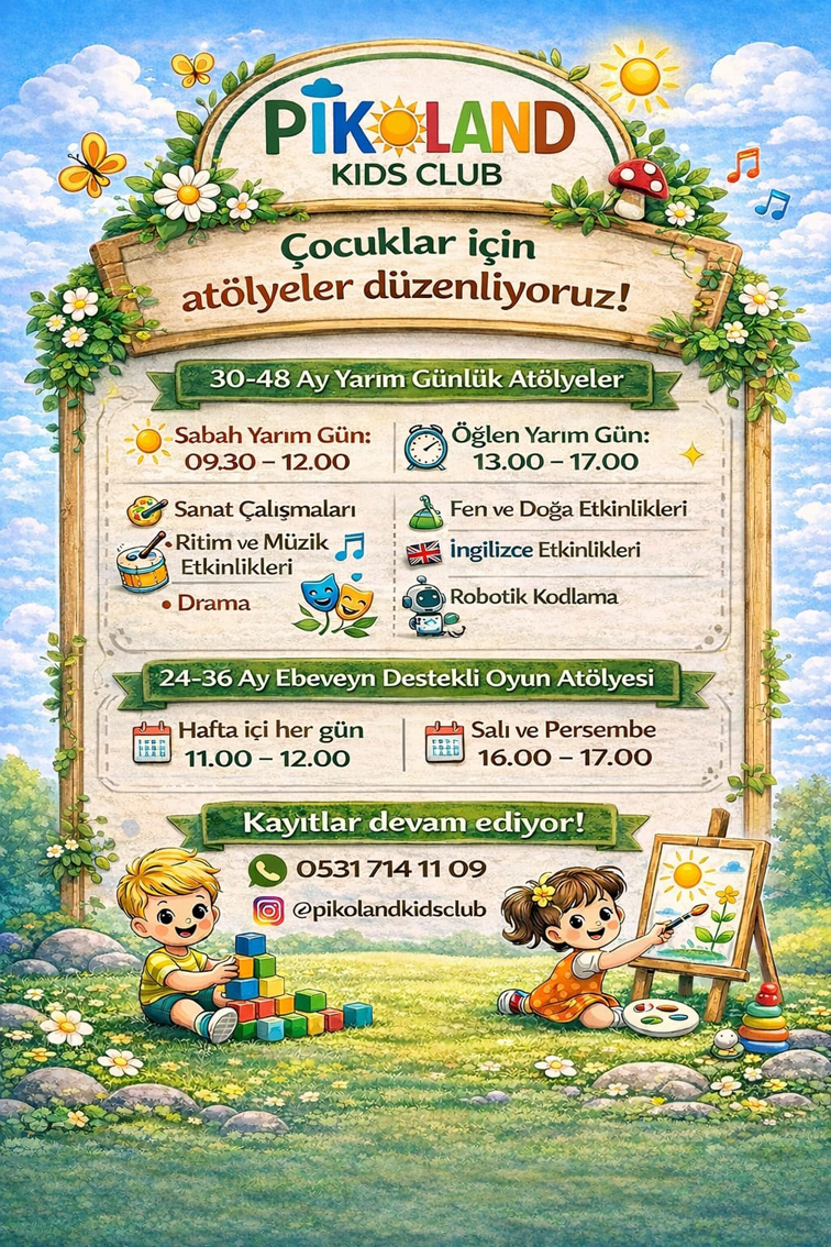 Pikoland Kids Club, çocukların gelişim dönemlerine uygun olarak hazırlanan atölye ve oyun programlarıyla eğitim ve eğlenceyi bir araya getiriyor. Merkezde 12–18 ay, 18–24 ay ve 24–30 ay gruplarına özel saatlik oyun atölyeleri düzenlenirken; 2,5–3,5 yaş grubu için sabah yarım gün, 3–5 yaş grubu için ise gelişim odaklı öğlen yarım günlük programlar sunuluyor.