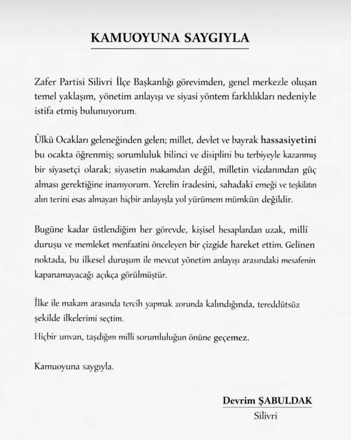 Zafer Partisi Silivri İlçe Başkanı Devrim Şabuldak, kamuoyuna yaptığı yazılı açıklamada istifasının gerekçesini, parti genel merkezi ile yaşanan temel yaklaşım, yönetim anlayışı ve siyasi yöntem farklılıkları olarak ifade etti.