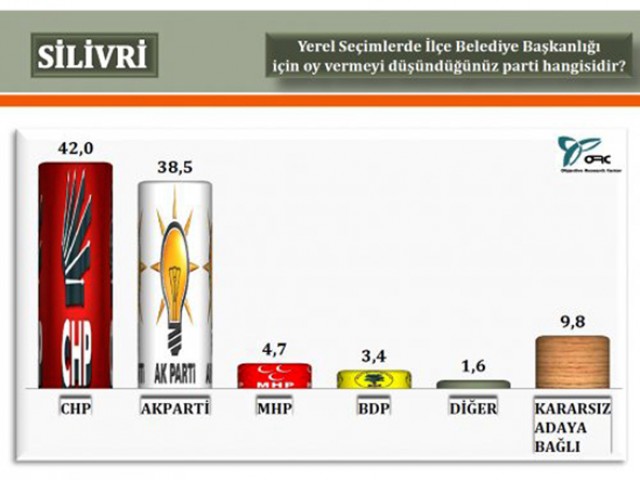 Silivri’de CHP % 42,0’la birinci çıkarken, AK Parti %38,5’le iktidar yarışından kopmadığını gösteriyor. MHP %4,7, BDP %3,4’le seçmen tercihlerine yansırken, %9,8 oranındaki kararsızlar seçimin neticesini etkileyecek en önemli faktör olarak gündemde. %1,6 oranında oy oranı da diğer partiler arasında dağılmakta.
