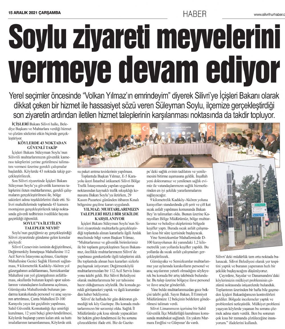 İçişleri Bakanı Süleyman Soylu'nun Silivri ziyaretinde muhtarlarla gerçekleştirdiği toplantıda alınan kararlarla ilgili Aralık meclisinde bilgi veren Başkan Yılmaz, “Muhtarlarımız ve güvenlik birimlerimiz ile bir toplantı gerçekleştiren Sayın Bakanımız, özellikle muhtarlarımızın Silivri'de yapılması gerekenlerle ilgili taleplerini aldı. Bu toplantıda alınan bazı kararları sizlerle paylaşmak istiyorum: Değirmenköylü muhtarlarımızdan bir 112 Acil Servis İstasyonu talebi geldi. Biz Silivri Belediyesi olarak muhtarlarımıza bir yer tahsisine hazır olduğumuzu söyledik. Bu konuda gerekli görüşmeleri yaptık ve ilgili kurumlardan haber bekliyoruz.