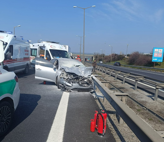 TEM Otoyolu Selimpaşa gişeleri yakınlarında meydana gelen trafik kazasında bariyerlere çarpan otomobilde yangın çıktı. Kazada biri ağır iki kişi yaralandı.