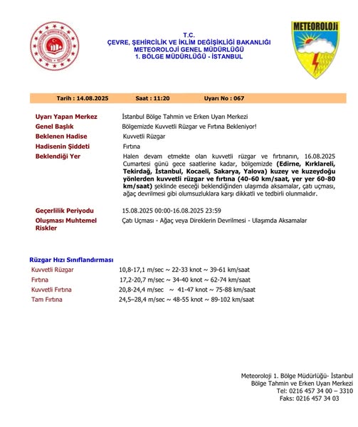 Yapılan uyarıda, halen devam eden kuvvetli rüzgâr ve fırtınanın 16 Ağustos 2025 Cumartesi günü gece saatlerine kadar Edirne, Kırklareli, Tekirdağ, İstanbul, Kocaeli, Sakarya ve Yalova illerinde kuzey ve kuzeydoğu yönlerden 40-60 km/saat, yer yer 60-80 km/saat hızla eseceği belirtildi.