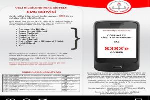 Öğrenci bilgileri mobil ortamdan SMS ile otomatik olarak alınabilmekte. Bunun için üye olmanız yeterli. Servise üye olmak için Öğrenci TC Kimlik Numarasını yazıp 8383'e göndermek gerekmekte.