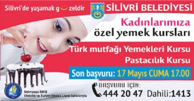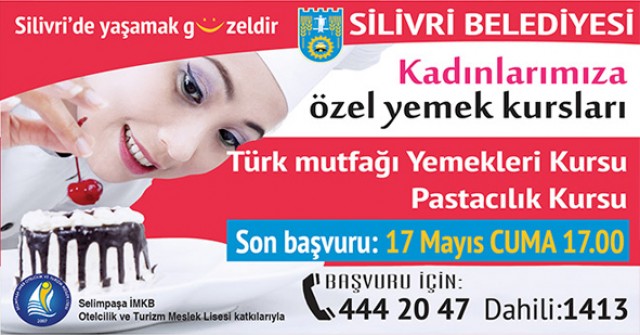 Silivri Belediyesi, kadınlara özel yemek kursları açma hazırlıkları içerisinde. Türk Mutfağı Yemekleri ve Pasta Kursları, Selimpaşa İMKB Otelcilik ve Turizm Meslek Lisesi’nde düzenlenecek ve eğitimler öğretmenleri tarafından verilecek. Kurslara katılmak isteyen tüm bayanların 17 Mayıs Cuma günü saat 17.00’a kadar 4442047 dahili: 1413 nolu telefona başvurması gerekmekte.